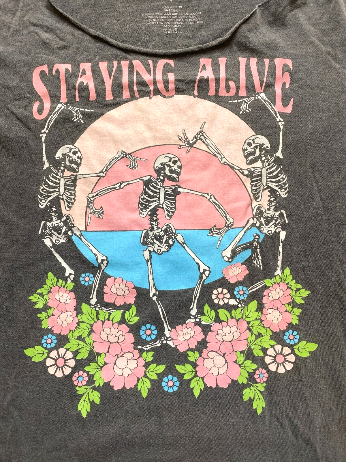 Staying Alive Shirt Womens Medium Gray Dancing Skeletons Flower Whimsigoth Goth