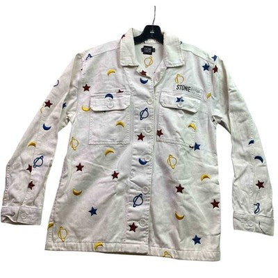 Keywords: Stone Row, White Shirt Jacket, Celestial, Stars, Moon, Embroidered, Button Down, Casual Shirt, Womens, Shirt Jacket, Space Theme, Astronomy Fashion