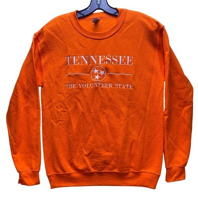 Embrace the spirited essence of Tennessee with this vibrant orange crew neck sweatshirt. The bold "TENNESSEE" lettering and "THE VOLUNTEER STATE" inscription, complete with the iconic three stars, are embroidered in crisp white, standing out against the bright orange backdrop. This sweatshirt is more than just a garment; it's a statement piece. Imagine yourself cheering on your favorite team at a game or relaxing on a cool evening, wrapped in the comfort and style of this unique sweatshirt. Perfect for showing off your state pride at casual gatherings or simply adding a pop of color to your everyday wardrobe.