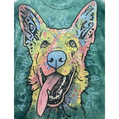 Keywords: The Mountain, graphic tee, dog shirt, German Shepherd, artistic, tie dye, casual wear, animal print, unique, bold design, dog lover, streetwear