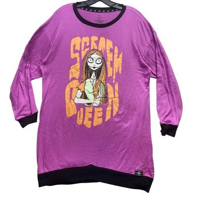 Keywords: Disney, The Nightmare Before Christmas, Sally, Scream Queen, Purple, Tunic Top, Women's Clothing, Graphic Tee, Long Sleeve, Casual, Spooky, Halloween, Tim Burton, Disneyana, Fan Apparel