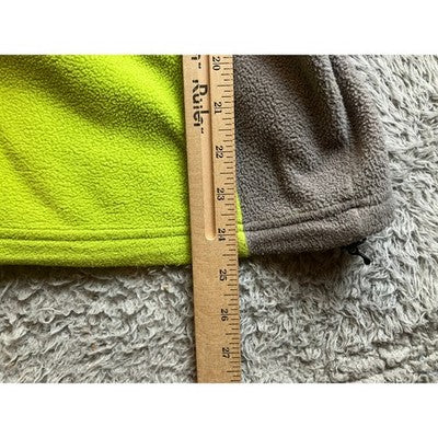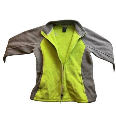 Embrace cool weather with this vibrant fleece jacket. As your go-to layer for lightweight warmth, this jacket makes a statement with its bright green body and contrasting gray sleeves and collar. It features a full zip front for easy layering and embroidered logo on the chest. Pair this jacket with jeans for a casual day out, layer it under a heavier coat for added warmth on a chilly hike, or wear it as a comfortable travel companion.