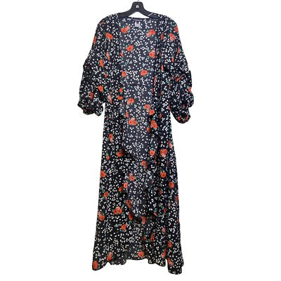 A cascade of blossoms awaits with this stunning floral duster! This kimono-style maxi dress features a captivating black backdrop adorned with vibrant red and delicate white floral patterns, creating a visually striking contrast. The ruched sleeves add a touch of playful elegance, while the flowing silhouette ensures a comfortable and flattering fit. Imagine yourself twirling through a garden party, attending a bohemian-chic wedding, or simply enjoying a relaxed evening at home in this versatile and eye-catching piece.