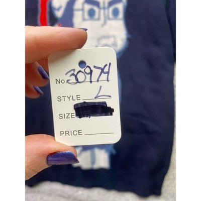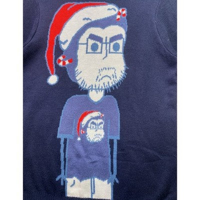 Embrace the festive spirit with this eye-catching Tipsy Elves RT Lifestyle graphic sweater. The bold navy blue knit showcases a whimsical character sporting a Santa hat and candy canes, complete with a miniature version of himself on a t-shirt. This sweater brings a playful and memorable touch to your holiday wardrobe, perfect for making a statement at any casual gathering. Ideal for holiday parties, casual Christmas get-togethers, or spreading cheer during the festive season.
