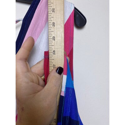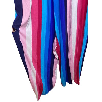 Radiant stripes define this Torrid jumpsuit, a vibrant statement piece ready to elevate your wardrobe. The flattering V-neckline and wide legs create a breezy, comfortable silhouette, while the colorful stripes add a playful touch. This jumpsuit features a surplice neckline, sleeveless design, and a self-tie at the back of the neck. Perfect for a sunny brunch with friends, a casual day of shopping, or a relaxed evening gathering.