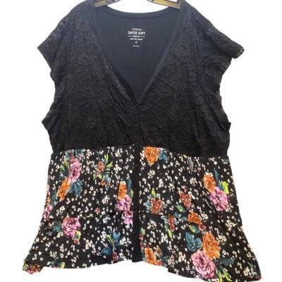 Keywords: Torrid, Plus Size, Blouse, Floral, Lace, Button Front, Super Soft, Knit Top, Womens Top, Tiered, Black Lace, Floral Print, Size 5, Womenswear