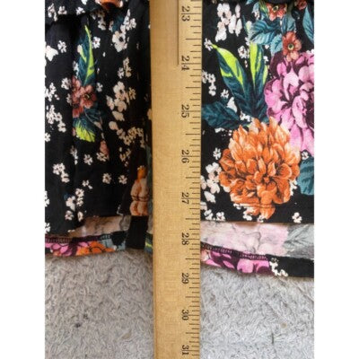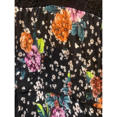 Whimsical charm abounds in this Torrid blouse, where delicate lace meets a vibrant floral print. The black lace bodice adds a touch of elegance, while the tiered floral print creates a playful, feminine silhouette. The button-front design allows for versatile styling, wear it buttoned up for a polished look or unbuttoned over a cami for a more relaxed vibe. This top is perfect for a casual brunch with friends, a garden party, or a romantic evening out.