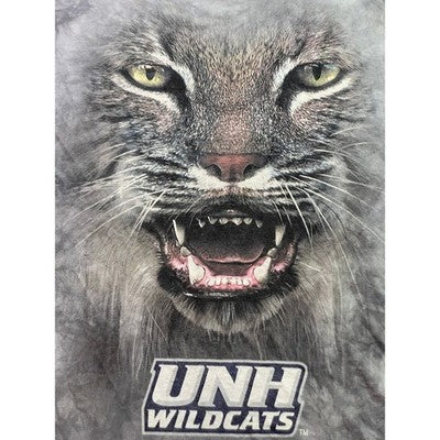 Unleash your wild side with this striking tie-dye graphic t-shirt, featuring a fierce bobcat design and the UNH Wildcats logo. The intricate, detailed graphic captures the intensity of the bobcat's gaze, while the tie-dye pattern gives it a trendy, edgy vibe. Perfect for expressing your unique style and supporting your favorite team, this tee is a definite conversation starter. Wear this statement piece to your next game day event, casual weekend outing, or even a laid-back campus gathering.