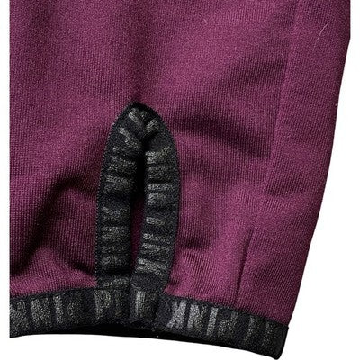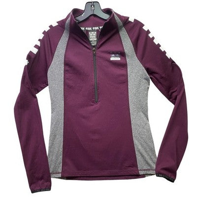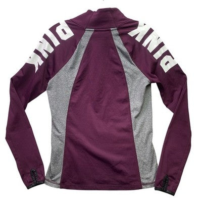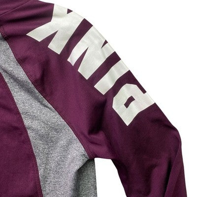 Elevate your activewear with this Victoria's Secret PINK Ultimate quarter-zip pullover. Experience ultimate comfort and style with its dynamic burgundy and grey color-blocking design, perfect for your toughest workouts or casual errands. The iconic "PINK" graphic emblazoned on the sleeves adds a touch of sporty flair, while the quarter-zip closure allows for customizable ventilation. This top is your go-to for gym sessions, weekend adventures, or cozy loungewear.