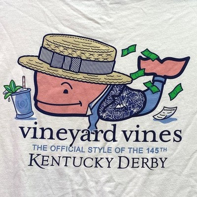 Dive into the spirit of the races with this charming Vineyard Vines T-shirt! Imagine strolling through Churchill Downs, mint julep in hand, feeling the electric atmosphere of the Kentucky Derby. This white tee features a delightful graphic of the Vineyard Vines whale decked out in a dapper hat and surrounded by "winner" money, capturing the essence of the 145th Derby. A matching pocket graphic adds a touch of whimsy to the front. Perfect for a casual day out, a Derby-themed party, or simply showing off your preppy style.
