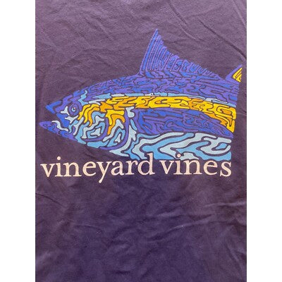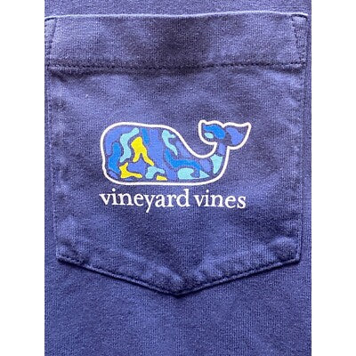 Dive into effortless style with this Vineyard Vines tee, a casual essential that speaks volumes. The vibrant, patterned whale logo on the chest pocket adds a playful pop of color, echoed by the larger graphic on the back. Crafted for comfort and designed for everyday wear, this short-sleeve t-shirt offers a relaxed fit and a soft feel. Note the small tear on the collar, adding a touch of lived-in character. Perfect for weekend adventures, beach days, or simply lounging in style, this Vineyard Vines tee is a versatile addition to any wardrobe.