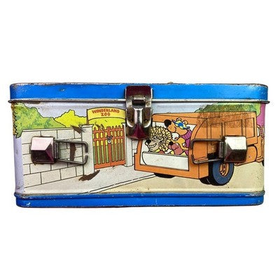 Relive nostalgic adventures with this vibrant 1971 Hair Bear Bunch tin lunch box and matching thermos set. This collectible piece bursts with colorful cartoon graphics, showcasing the beloved characters from Hanna-Barbera Productions. The durable tin lunch box features a secure latch and handle, perfect for carrying snacks or treasures, while the thermos keeps drinks refreshingly cool or delightfully warm. Imagine packing a delightful picnic for a day at the park, sending a child off to school with a touch of vintage charm, or displaying this unique set as a conversation starter in your retro collection.