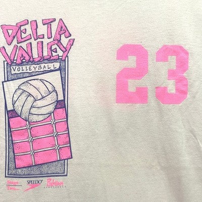 Serve up some serious vintage vibes with this unique Delta Valley volleyball t-shirt! A piece of sportswear history, this tee boasts a bold and eye-catching graphic featuring the words "Delta Valley Volleyball" surrounding the number 23 in a vibrant pink. The front design is mirrored on the back, creating a standout look from every angle. Featuring the Oneita Power tag, it's a testament to the shirt's quality and durability. Pair it with your favorite jeans for a casual-cool everyday look, rock it at your next beach volleyball game, or add some vintage flair to your workout gear. An ideal choice for a throwback sports event!