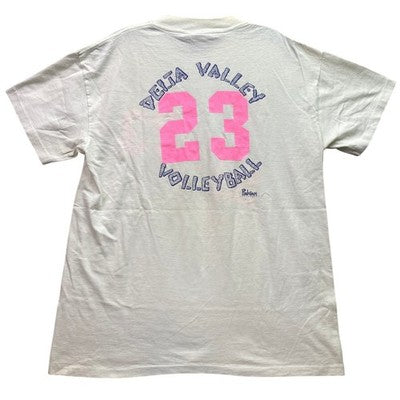 Keywords: vintage t-shirt, delta valley volleyball, oneita power, graphic tee, menswear, retro, 90s, volleyball shirt, sports tee, casual wear, streetwear, vintage clothing, pink graphic, white tee, large t-shirt