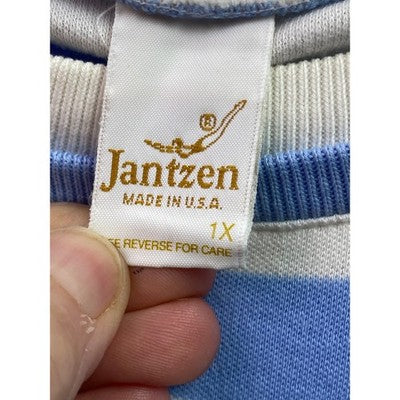 Keywords: Jantzen, striped t shirt, vintage t shirt, womens t shirt, plus size t shirt, blue and white shirt, beach graphic tee, nautical t shirt, retro tee, made in usa, 1X, oversized tee, casual top, short sleeve shirt
