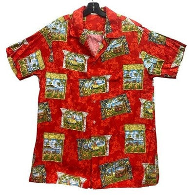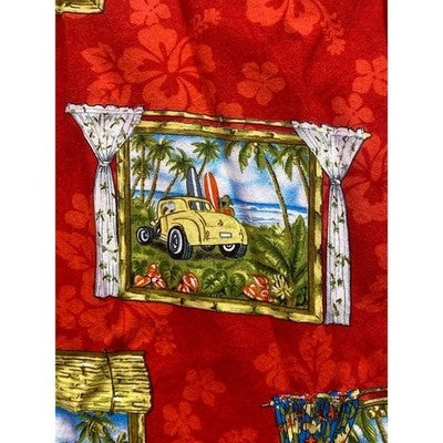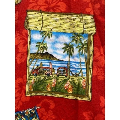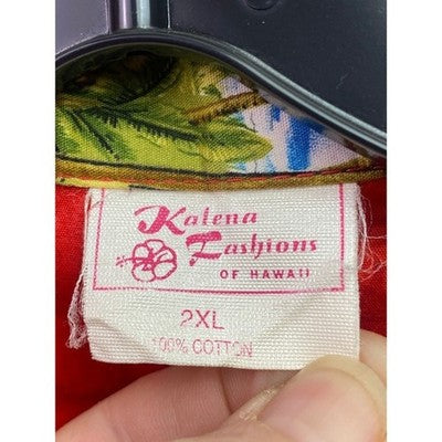 Keywords: Hawaiian shirt, Aloha shirt, Tropical shirt, Vintage Hawaiian shirt, Men's Hawaiian shirt, Resort wear, Beach shirt, Kalena Fashions of Hawaii, 2XL shirt, Palm tree shirt, Surf shirt, Car print shirt, Red Hawaiian shirt, Scenic shirt