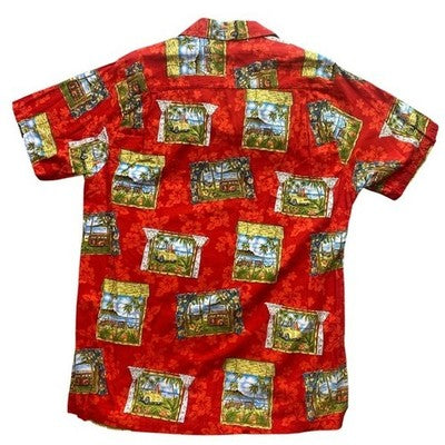 Transport yourself to a tropical paradise with this vibrant Hawaiian shirt. Imagine the soft caress of the fabric against your skin as you embrace island vibes. A captivating tableau of beachside scenes featuring classic cars, swaying palm trees, and serene ocean views adorns the entirety of the shirt, creating a visual feast. The lively red hue radiates warmth and adds an electrifying touch to your wardrobe. Perfect for luaus, beach parties, or adding a splash of vacation spirit to your everyday attire.
