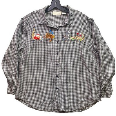 Keywords: Lemon Grass, Christmas Shirt, Cat Embroidery, Gingham Shirt, Holiday Top, Button Down Shirt, Vintage Shirt, Women's Shirt, Black and White Shirt, Long Sleeve Shirt, XL Shirt, Holiday Cats, Festive Shirt, Embroidered Shirt