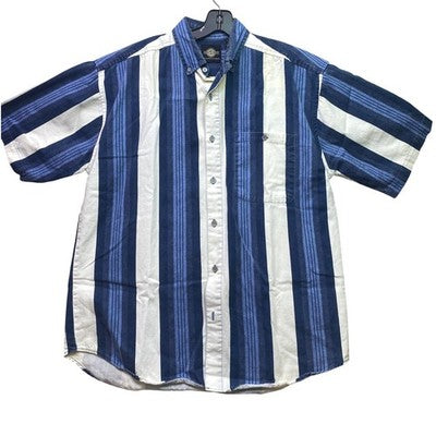 Own a piece of casual cool with this DANTANA short sleeve button down shirt. The bold vertical stripe pattern in rich blues and crisp white creates a dynamic visual that's perfect for making a statement. A classic chest pocket adds functional style, while the comfortable cotton fabric ensures all-day wearability. Elevate your everyday look with this versatile shirt, ideal for weekend outings or relaxed evenings.