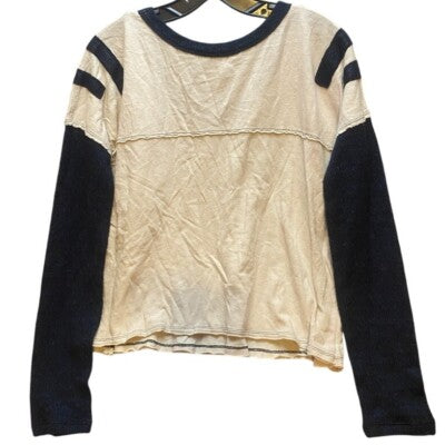 Keywords: We The Free, bohemian top, long sleeve top, graphic tee, embellished top, boho shirt, casual top, women's top, medium size, cream top, black accents, geometric pattern, festival wear, Free People