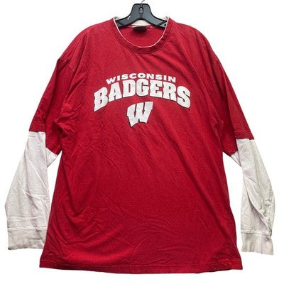 Show your unwavering support for the Wisconsin Badgers with this dynamic long-sleeve layered t-shirt. The bold red tee features the iconic "Wisconsin Badgers" lettering arched across the chest with a prominent "W" logo, ensuring your team spirit is unmistakable. The crisp white sleeves create a stylish, built-in layered look, offering both comfort and a classic athletic aesthetic. Perfect for game days, casual outings, or representing your alma mater with pride.