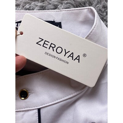 Elevated style awaits with this crisp white dress shirt, where intricate black embroidery dances across the chest, adding a touch of refined artistry to your wardrobe. The sleek button-down design, complete with a mandarin collar and contrasting black trim, exudes modern sophistication. Imagine the smooth feel of the fabric against your skin as you fasten the elegant gold-tone buttons, each detail carefully considered for a polished look. This shirt is perfect for making a statement at a semi-formal event, adding a touch of class to a business-casual setting, or elevating your everyday style with effortless charm.