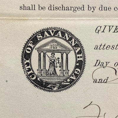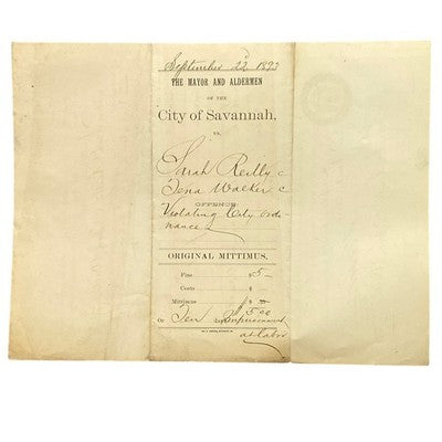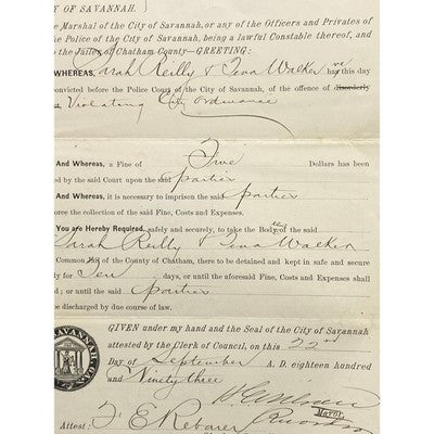 Step back in time with this fascinating original arrest document from 1893, issued in Savannah, Georgia! The document details the arrest of Sarah Reilly and Tena Walker for violating a city ordinance, offering a glimpse into the legal and social history of the late 19th century. The formal language, handwritten details, and official seal of the City of Savannah add to the document's historical significance. Imagine this conversation-starting document framed on your wall, or preserved within an antique collection as a unique piece of Southern Americana. Perfect for historians, genealogists, collectors of ephemera, or anyone intrigued by Savannah's rich past.