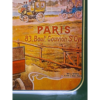 Step back in time with this vintage Automobiles Peugeot serving tray, a captivating piece of Parisian history. The tray showcases a vibrant scene of early 20th-century Paris, complete with vintage automobiles and elegantly dressed figures. The rich colors and intricate details bring a touch of old-world charm to any space. Perfect for serving drinks, displaying decorative items, or simply adding a touch of vintage flair to your home. This tray is ideal for collectors, vintage enthusiasts, or anyone looking to infuse their decor with a touch of Parisian elegance. It would be a great addition to a home bar, a vintage-themed kitchen, or as a unique decorative piece in a living room.