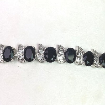 Keywords: black gemstone bracelet, oval gemstone bracelet, silver tone bracelet, women's bracelet, fashion bracelet, elegant bracelet, tennis bracelet, anniversary gift, evening jewelry, statement bracelet, sparkling bracelet, black and white jewelry