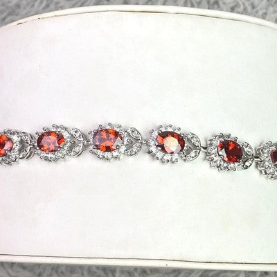 Adorn your wrist with the captivating allure of this exquisite tennis bracelet. Each oval-cut red garnet, a vibrant gem radiating warmth and passion, is embraced by a halo of shimmering cubic zirconia stones, creating a breathtaking sparkle with every movement. The delicate silver-tone setting features intricate leaf-like accents between the main stones, adding a touch of organic elegance to its design. Secured with a robust clasp, this bracelet promises both beauty and comfort, making it a perfect accessory for celebrating anniversaries, adding a touch of glamour to evening events, or simply brightening your everyday ensemble.