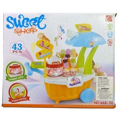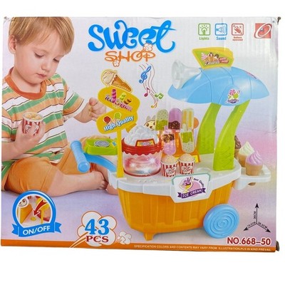 Spark imaginative play with this delightful Sweet Shop ice cream cart, bringing endless hours of fun and creativity to your child's playtime. Watch their eyes light up as they serve up imaginary treats with the included 43 pieces, featuring colorful ice cream cones, popsicles, popcorn cups, and even play coins for a realistic shopping experience. The cart boasts engaging lights and sounds, powered by batteries for interactive enjoyment, and a convenient storage function to keep all the accessories neatly organized. Perfect for aspiring young entrepreneurs, this charming playset is ideal for indoor playdates or as a captivating addition to a play kitchen setup.