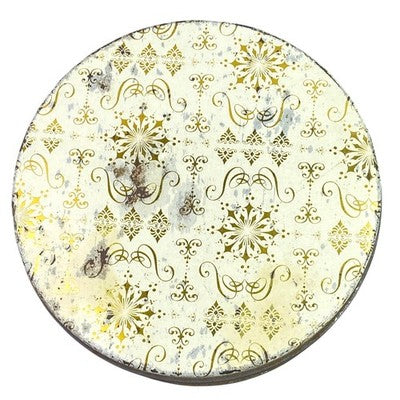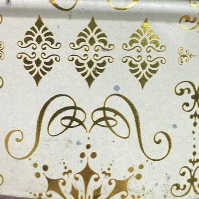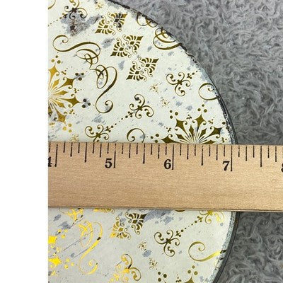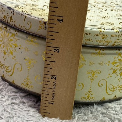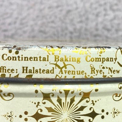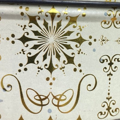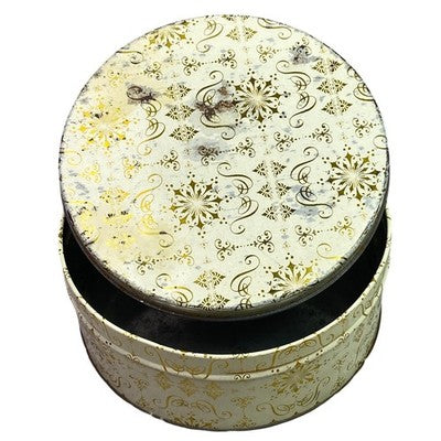 Discover a charming vintage storage tin, adorned with an elegant gold snowflake pattern on a creamy background. This round container from the Continental Baking Company evokes a sense of classic charm and nostalgic holidays. Its sturdy metal construction makes it perfect for keeping cherished keepsakes, baking supplies organized, or as a decorative piece on display. Imagine this tin gracing your kitchen counter during the holiday season, holding freshly baked cookies, or adding a touch of vintage elegance to your craft room organization. It's ideal for holiday gifting, storing seasonal decorations, or simply adding a whimsical touch to your home decor.