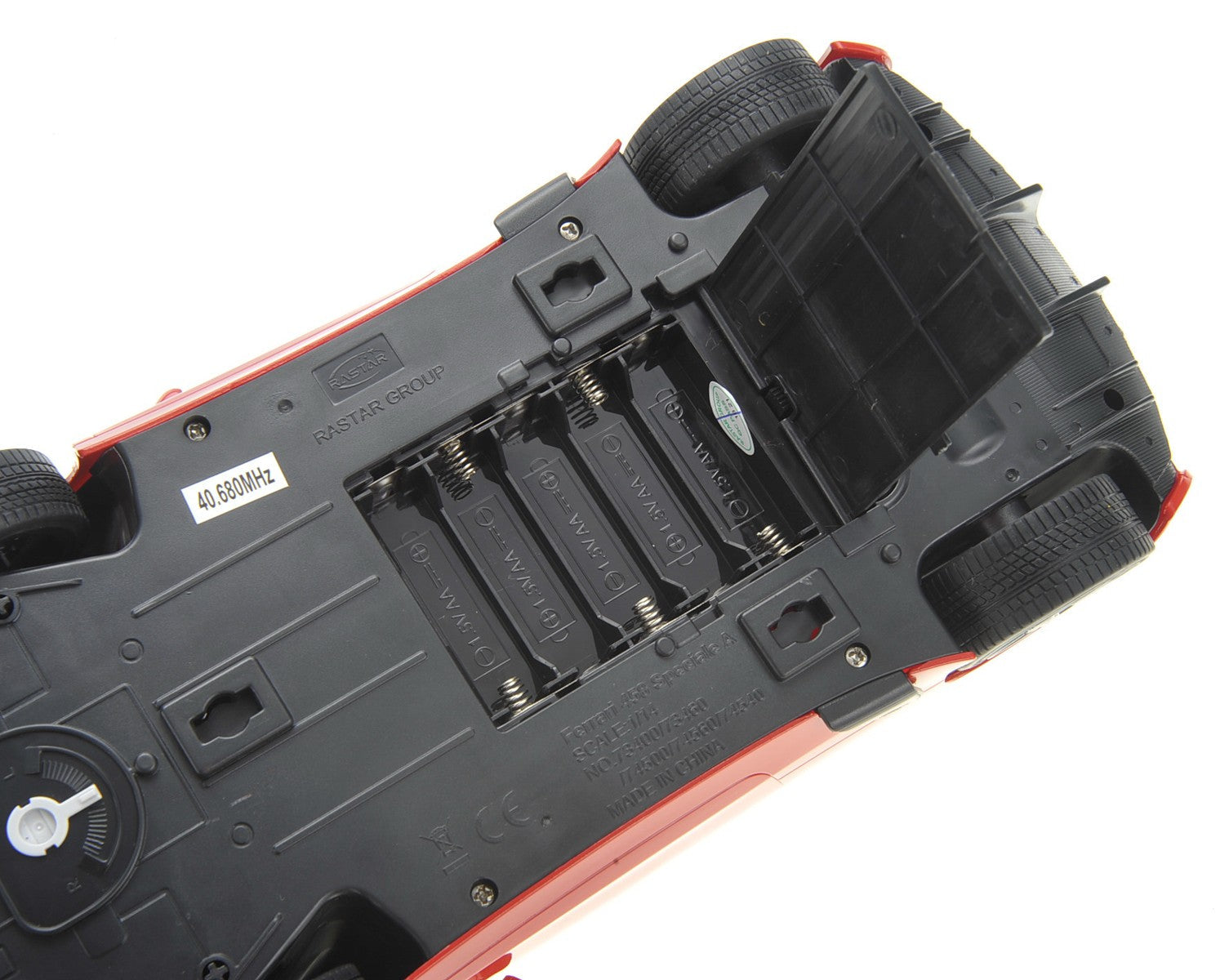 Full Function Radio Controlled Forward, Reverse, Stop, Left & Right Adjustable Front Wheel Alignment All Independent Spring Suspension System Detailed Interior / Exterior Rims & Tires Glossy Exterior Paint, Speed: 8-10 mph Scale: 1:14, Remote Distance: 30 ft Factory Assembled Ready to Run. 5X AA Batteries (Not Included) and 1 9V Battery required (Not included). Packaging include: Car, 1 Remote Control, 1 User Manual