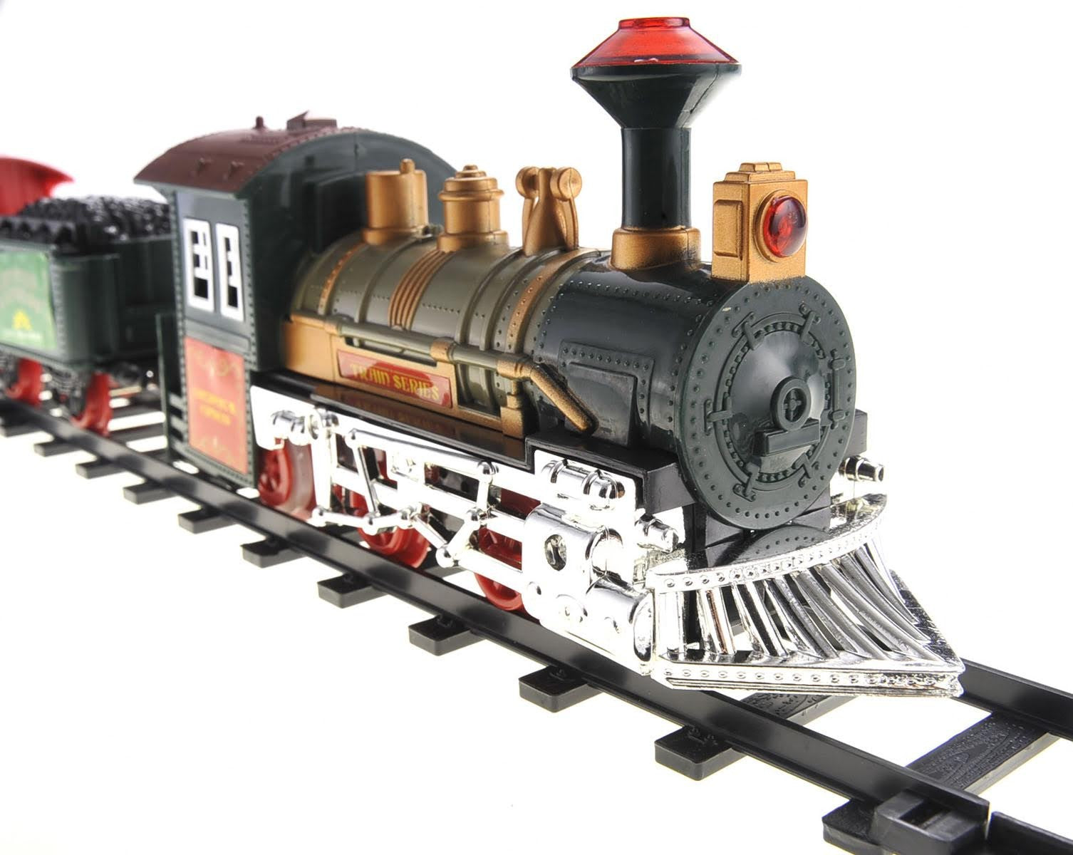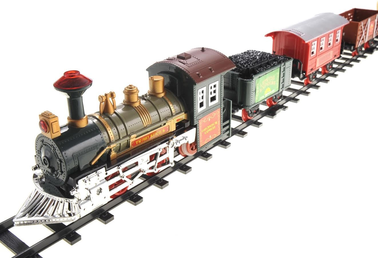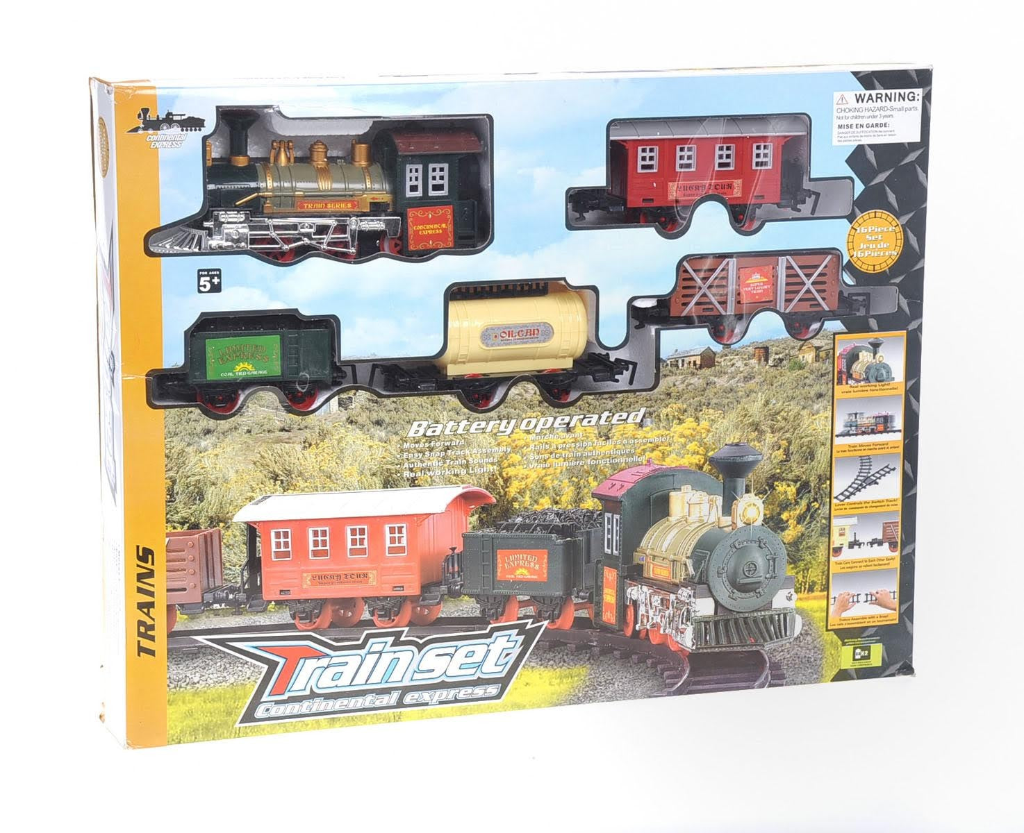 This continental express toy train set comes with a train head, coal tender, passenger wagon, fuel wagon, animal wagon, and train tracks to assemble! The tracks can easily be assembled by snapping the pieces together to create an endless combination of track designs. Setting up the train set is a perfect way to bond with your children as you work together. The tracks are standard size, so you can combine these tracks with all other 1:8 scale tracks. The continental train track is more than 14ft long, and when assembled is 5 feet in length, and 4 feet in width. It should fit in any standard room.