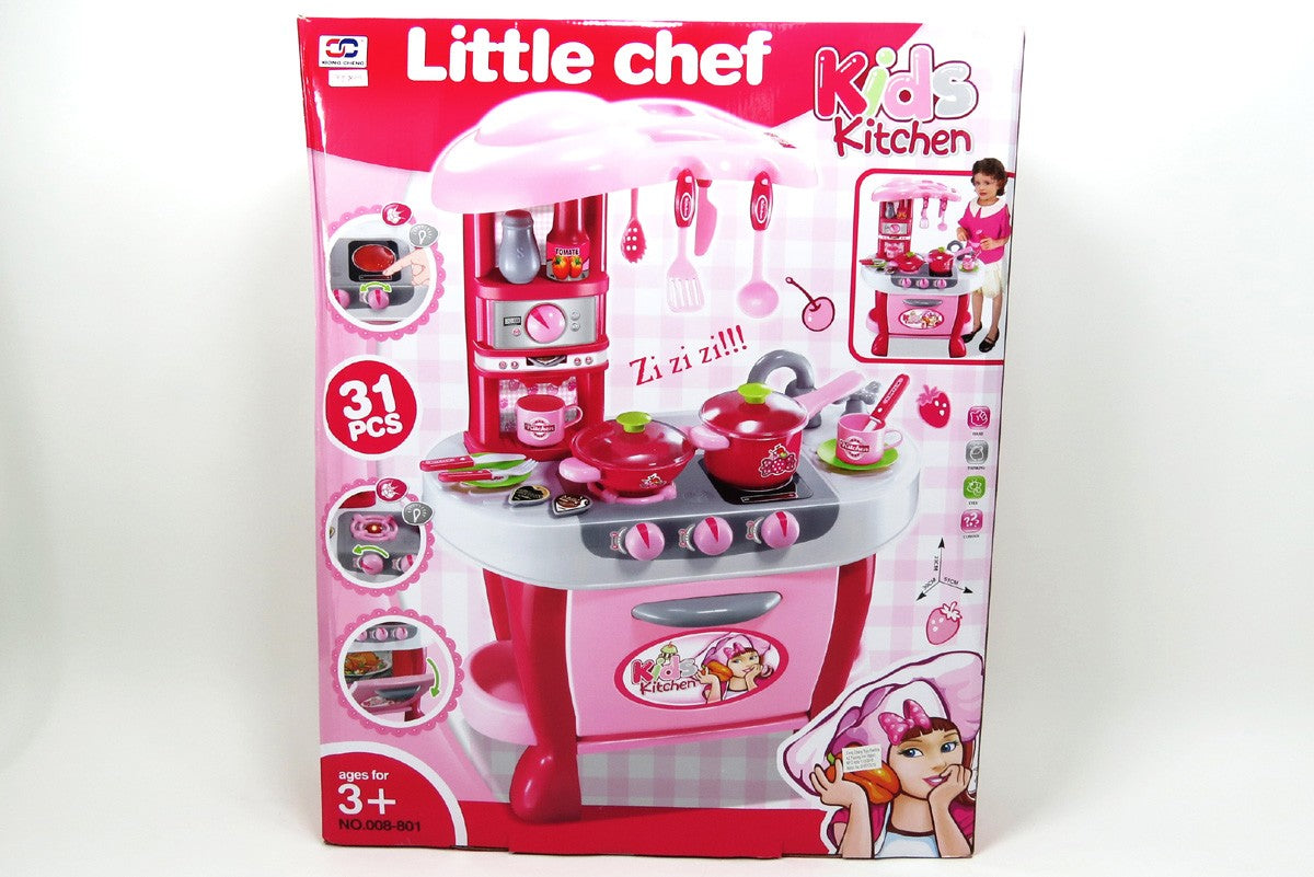 This is the perfect kitchen play set for a future chef! This kitchen appliance play set comes with a stove, sink, and oven. The stove top lights up and emits the sound of boiling water like an actual stove with the turn of a knob. The play set also includes pots, utensils, and other accessories to form a complete kitchen!