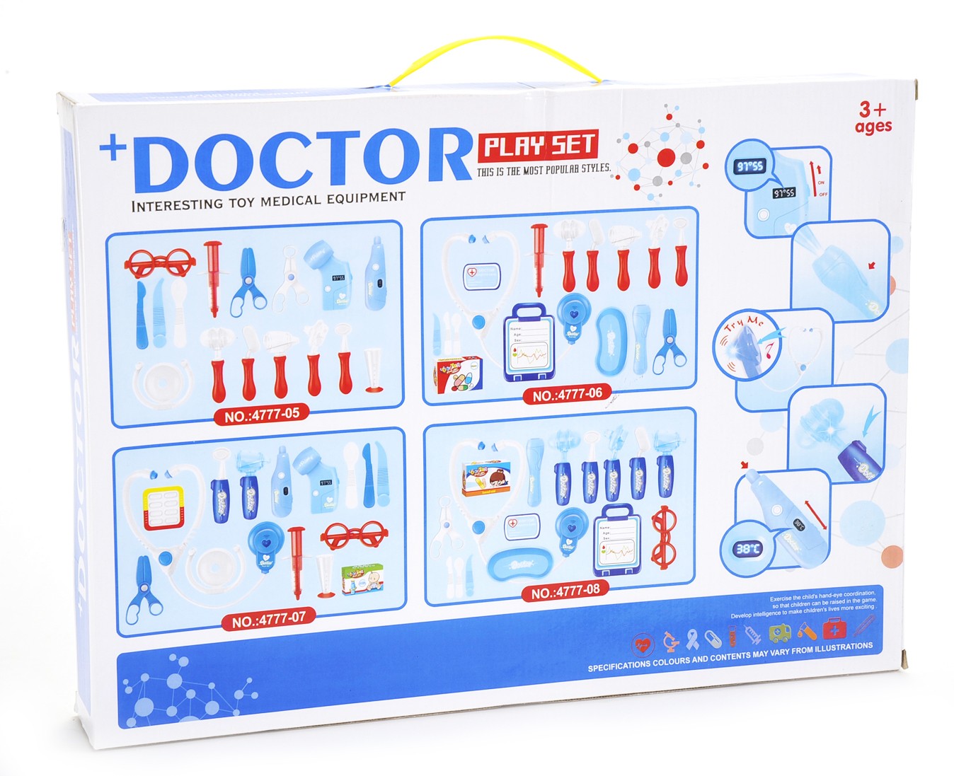 This doctor set is fun! Comes with 16 different medical tools. Play tools include a stethoscope, flashlight, syringe, scissor, reflex hammer, and 4 more red handle tools. Also includes clipboard, ID badge, box of medicine, plate, tweezers, scalpel, and spoon.