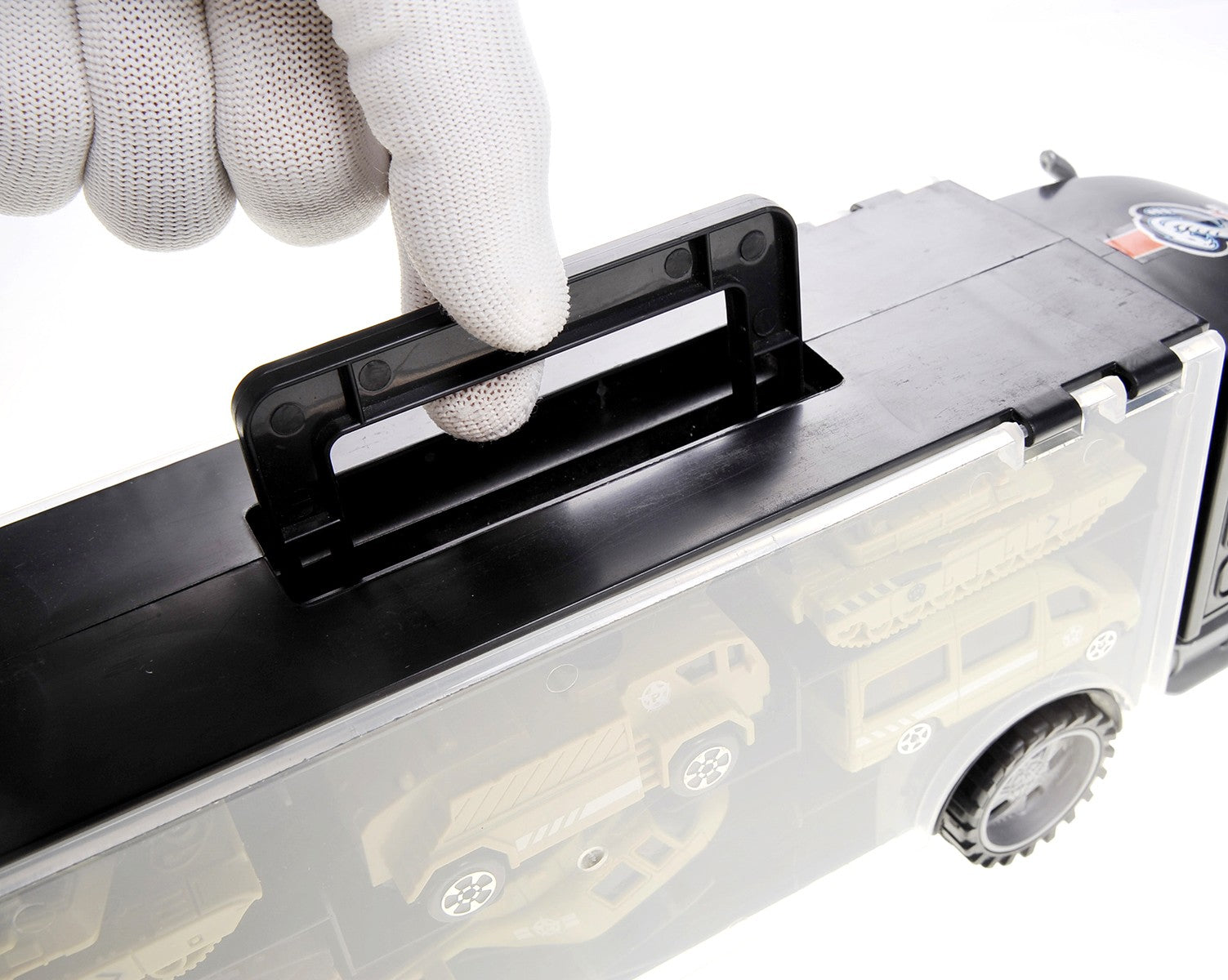 Fighter Military Transport Truck Design to hold and store Combat Vehicles such as Helicopters, Tanks, Jeeps, and Transport cars. This Vehicle is designed for kids that love military toys! The Truck is able to store combat vehicles.