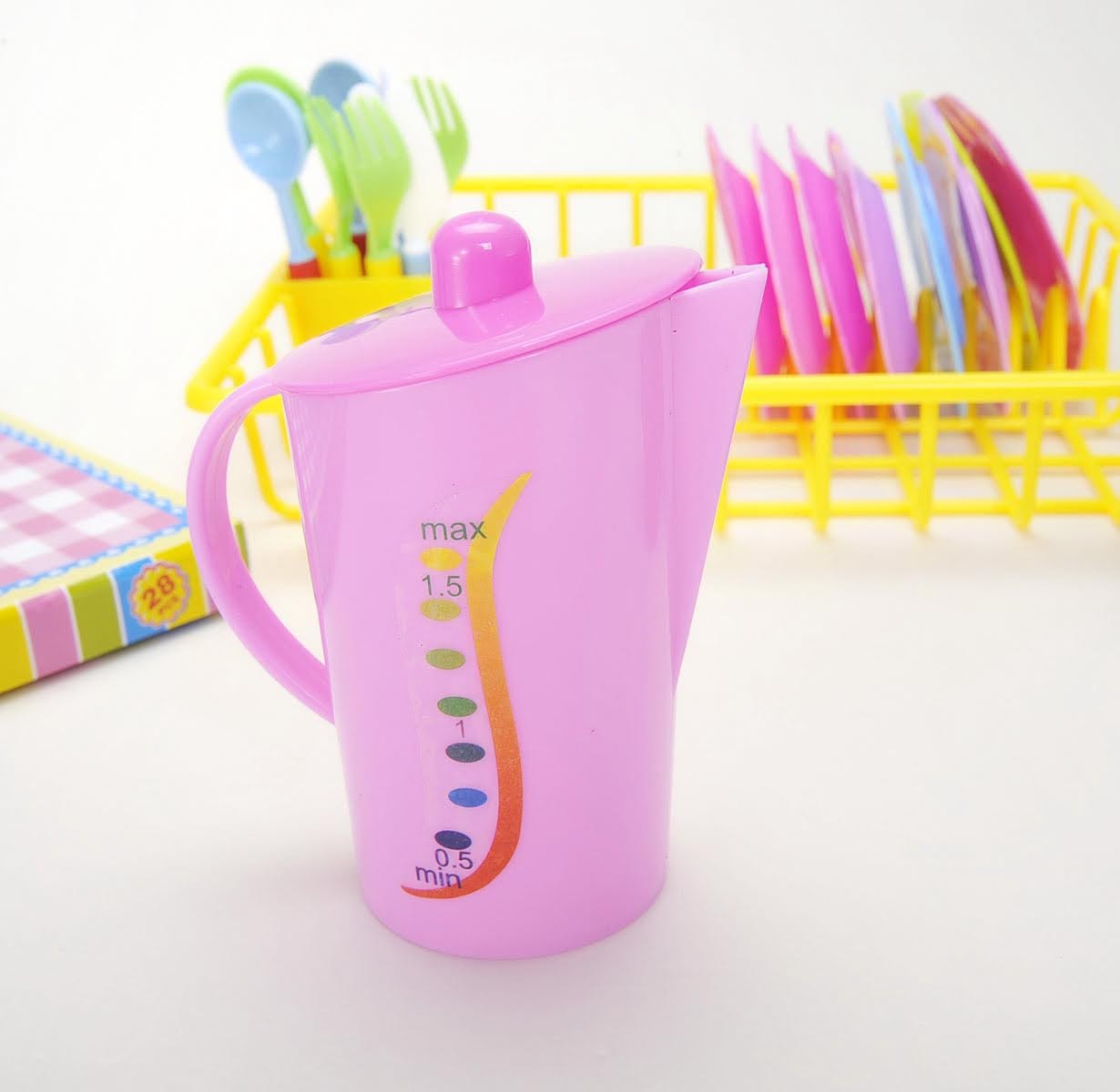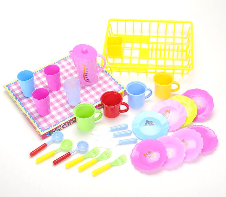 Set the perfect table for your play-food feasts and pretend tea parties. This sturdy play set comes with 8 plastic plates; four cups, 4 mugs, 3 spoons, 3 forks, 3 knives, water pitcher, plastic drying rack with utensil-holding insert. Add them to a play kitchen or use as a stand-alone play set. 27 Pieces total. Ages 3 and Up.