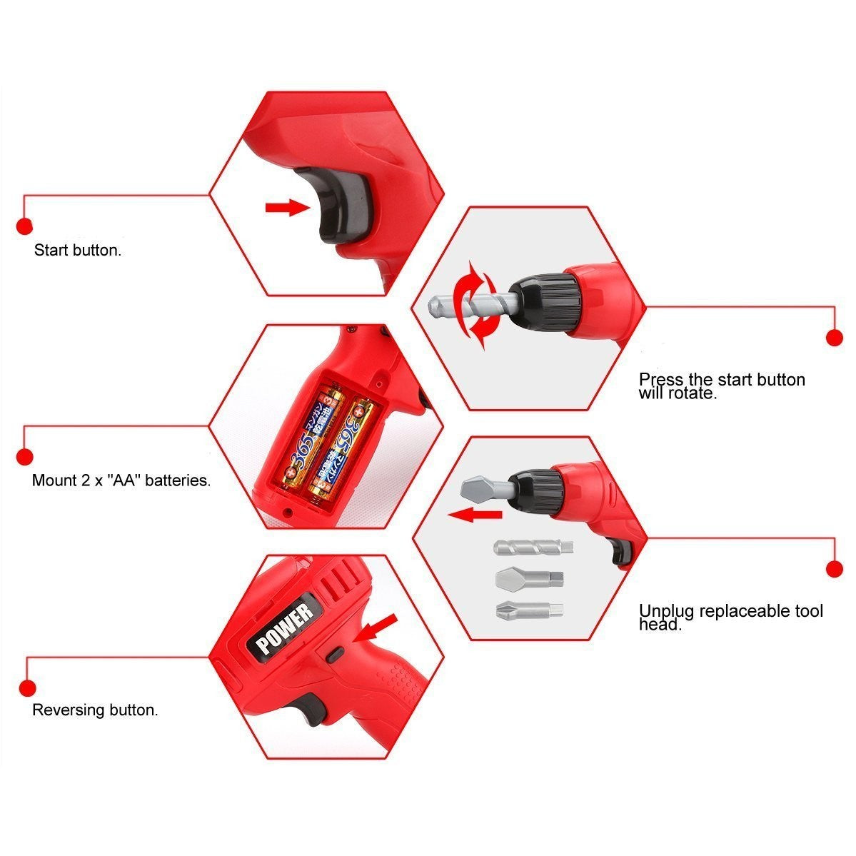 A Child size Power Drill for your kids with interchangeable drill bits. Has realistic drilling sounds and motion. It can retract as well. It is a great toy for a child who loves tools also for kids that like to copy their dads!