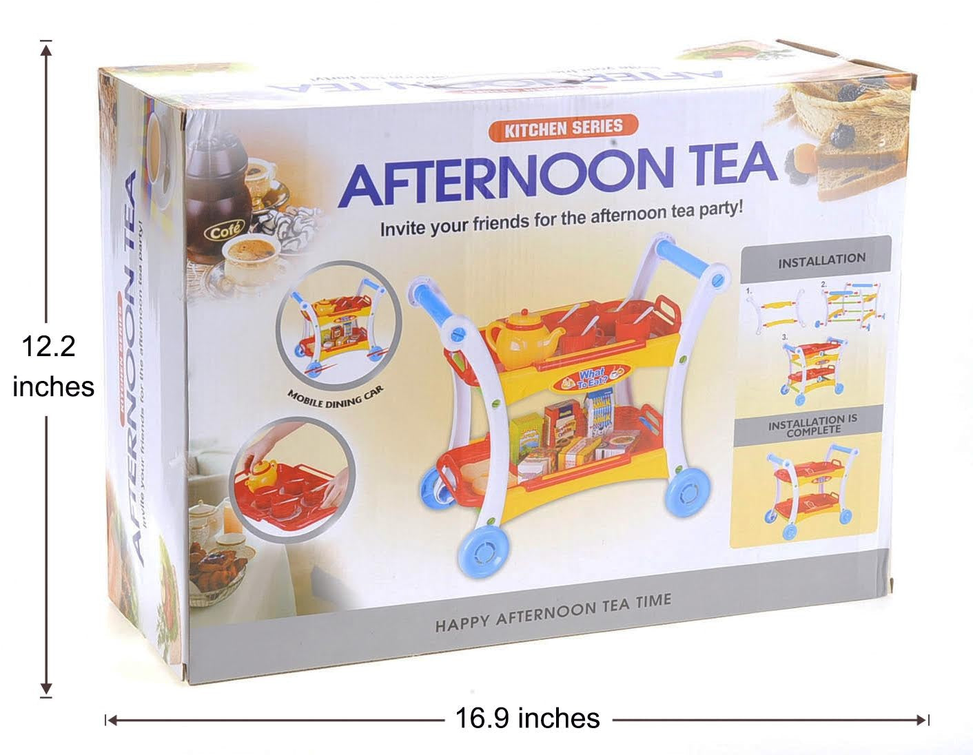 It's tea time, and your little hostess will be well prepared for the party with this plastic 23 piece tea set and trolley. Set includes tea cart/trolley, teapot, cups, toast, utensils and more. Rolling Cart with Removable Tray to Display All the Goodies. It's easy to assemble and requires no tools. Measures 17" x 13" x 20". Adult supervision recommended.