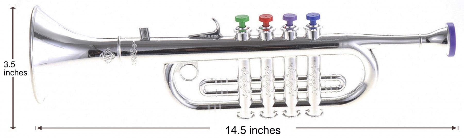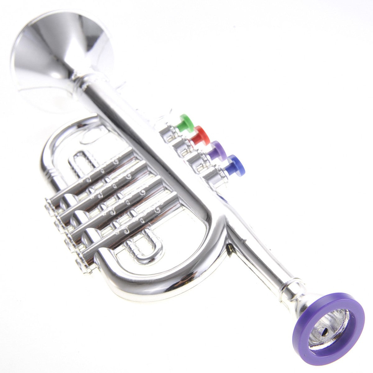 Let your child explore the sound of music and let them have fun using the easy to play trumpet that mimics the sound of a real trumpet. Studies have shown that kids who learn to play an instrument are proven to improve on other skills such as, science and math. The 4 colored key trumpet is made out durable material and very shiny just like an instrument. It also makes a great gift for kids and a great way to show how music can make an impact their lives.