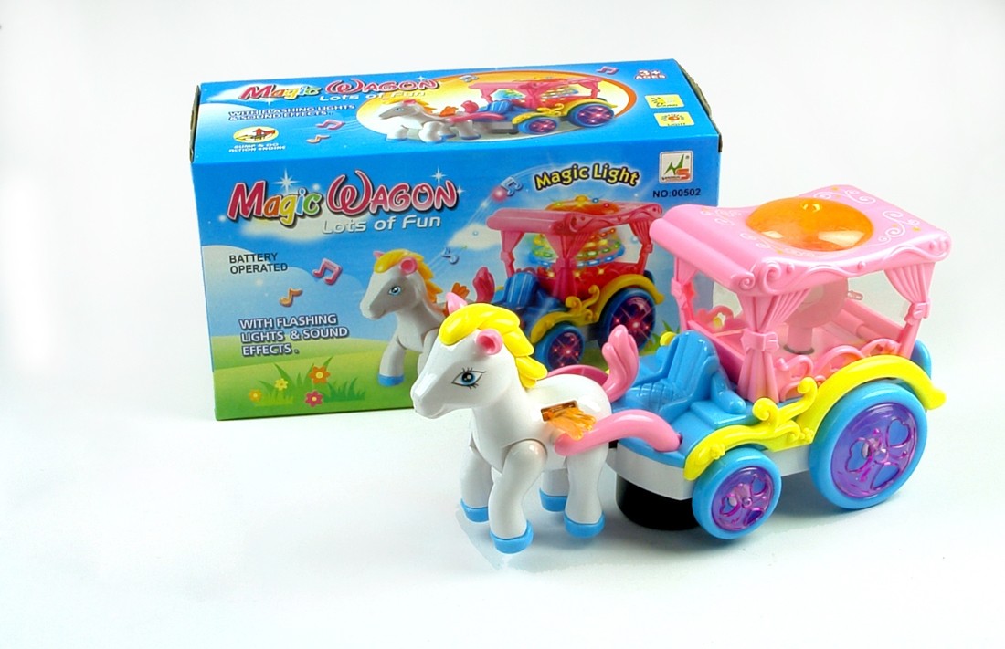 A Magical Pegasus carriage toy that creates a fantastical fun time for children and young kids! Watch as it comes to life and parade through in its majestic space. The toy lights up and virtually sings and plays songs for an exciting and engaging time.