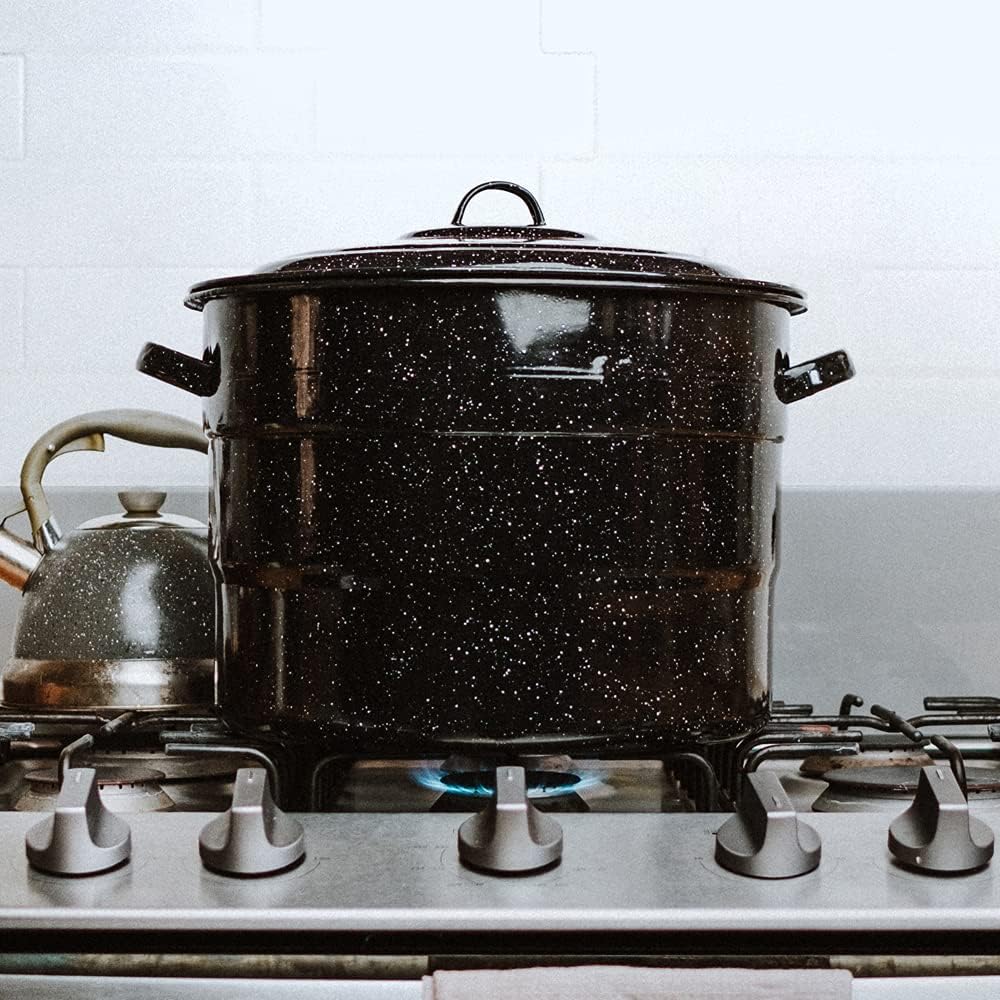 • The canner features a porcelain surface with a durable steel core that provides excellent heat distribution.