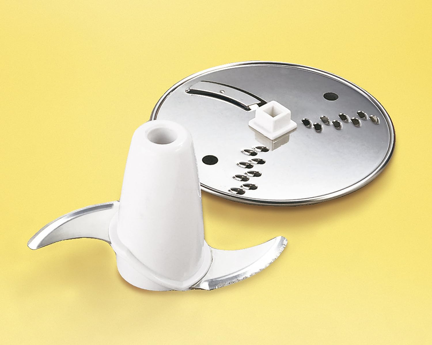 • 2 blades: Chopping/Mixing blade & Reversible Slicing/Shredding Disc