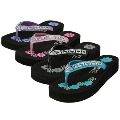 Wholesale Girl's "Easy USA" Floral Printed Rhinestone Upper Wedge Filp Flops (*Asst. Black Pink Turq. & Purple)
