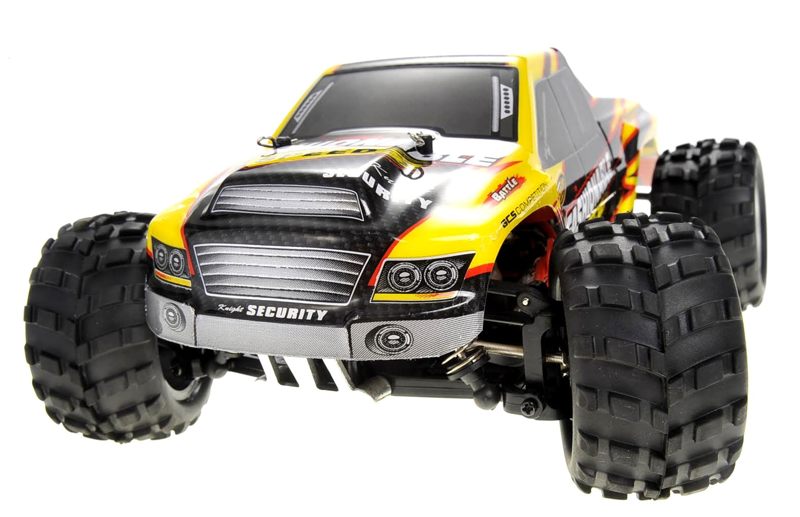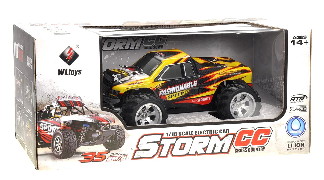 Description: This 1/18 scale yellow truck will be suitable to play in indoor or outdoor grounds. The truck features a 4WD suspension that will be able to handle rocky and dirty roads. Speeds can reach up to 35km/H and the run time will approximately be 10 minutes.