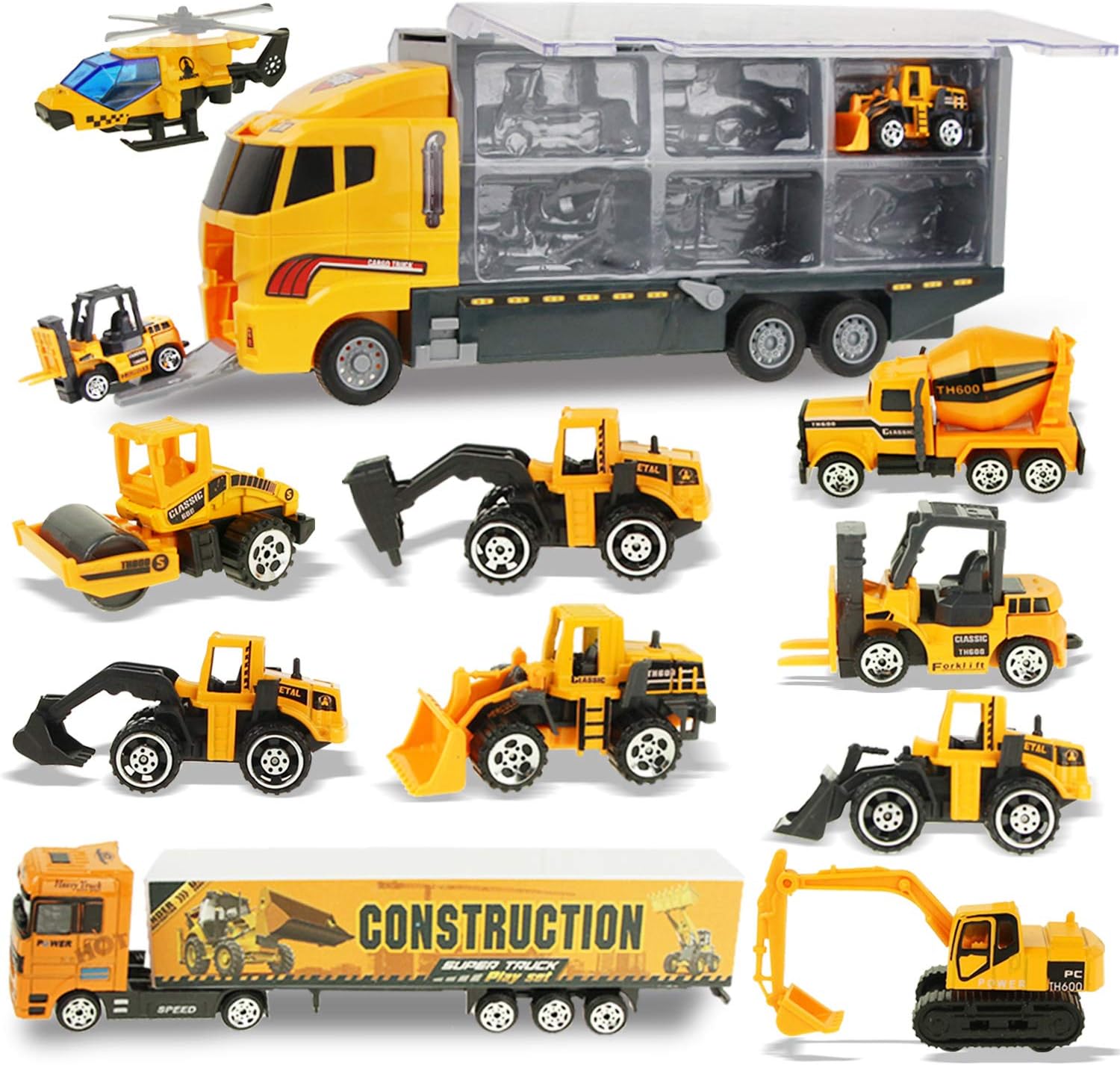 SUPER VALUE. 11 Mini Construction Truck Toy Set in Various Designs and Functions in One Carrier Truck. Including Helicopter, Wheel Loader, Dump Truck, Bulldozer, Excavator, Mixer, Backhoe, Road Roller, etc.