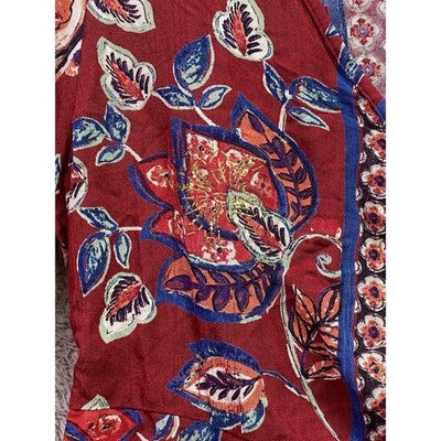 Enliven your wardrobe with this stunning bohemian-inspired blouse, a testament to effortless style and vibrant artistry. The mesmerizing floral print cascades across a rich red backdrop, interwoven with hues of blue, orange, and cream to create a kaleidoscope of color. Dramatic kimono sleeves flow with an airy grace, adding a touch of elegance to the relaxed silhouette. A cinched waist accentuates the figure, while the lightweight fabric ensures all-day comfort. Perfect for a casual brunch, a garden party, or a sunset stroll, this blouse infuses every occasion with bohemian charm.