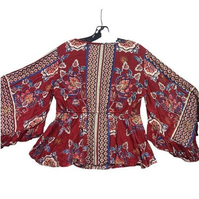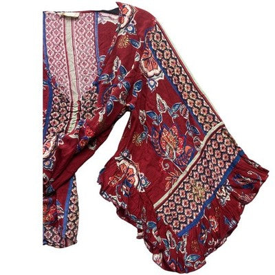 Keywords: Altar'd State, Bohemian blouse, Floral print, Kimono sleeves, Red blouse, Lightweight top, Boho top, Festival wear, Women's blouse, Casual top, Cinched waist, Rayon blouse, bohemian, floral, blouse