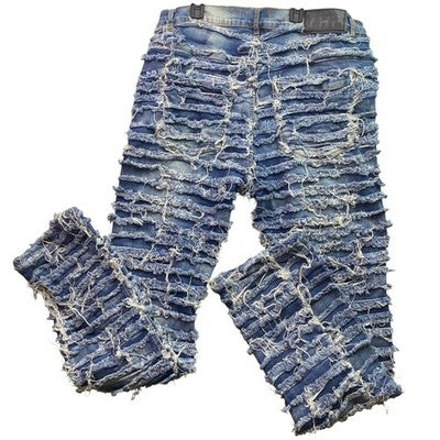 Dare to stand out with these one-of-a-kind jeans that explode with edgy style. Crafted with a radical design, the shredded and distressed details deliver an unparalleled visual impact. Each rip and fray is meticulously placed, creating a textural masterpiece that demands attention. The deep indigo wash offers a classic yet versatile backdrop, ensuring these pants become the focal point of any outfit. Pair with a basic tee and sneakers for an off-duty model vibe, or dress them up with a blazer for an unexpected take on smart casual. Perfect for a night out, a music festival, or any event where you want to showcase your individuality.